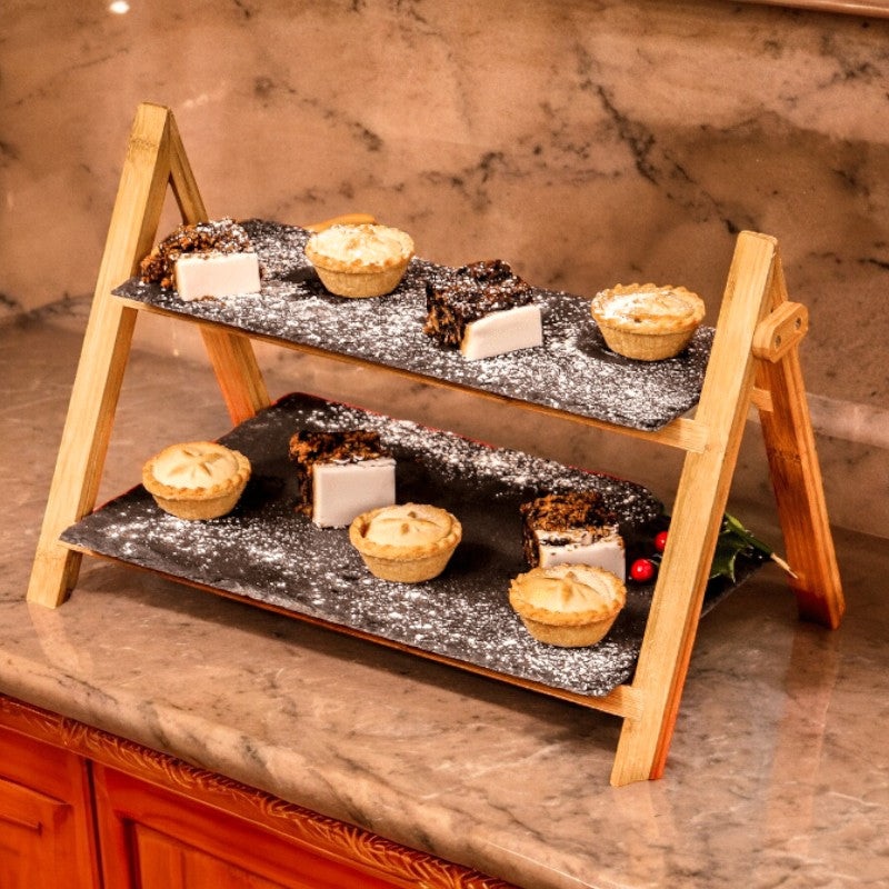 This two-tier slate cake stand offers an aesthetic presentation option for desserts or hors d’oeuvres. Its wood construction and two removable slate platters simplify serving, providing ease of assembly and convenience. This stand is sure to be a hit at any event, adding a desirable, unique touch to impress your guests.