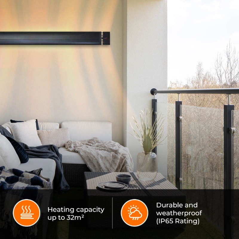 This outdoor radiant heater delivers year-round comfort with weatherproof IP65 construction, four power settings, remote control, silent operation and a 24-hour timer.