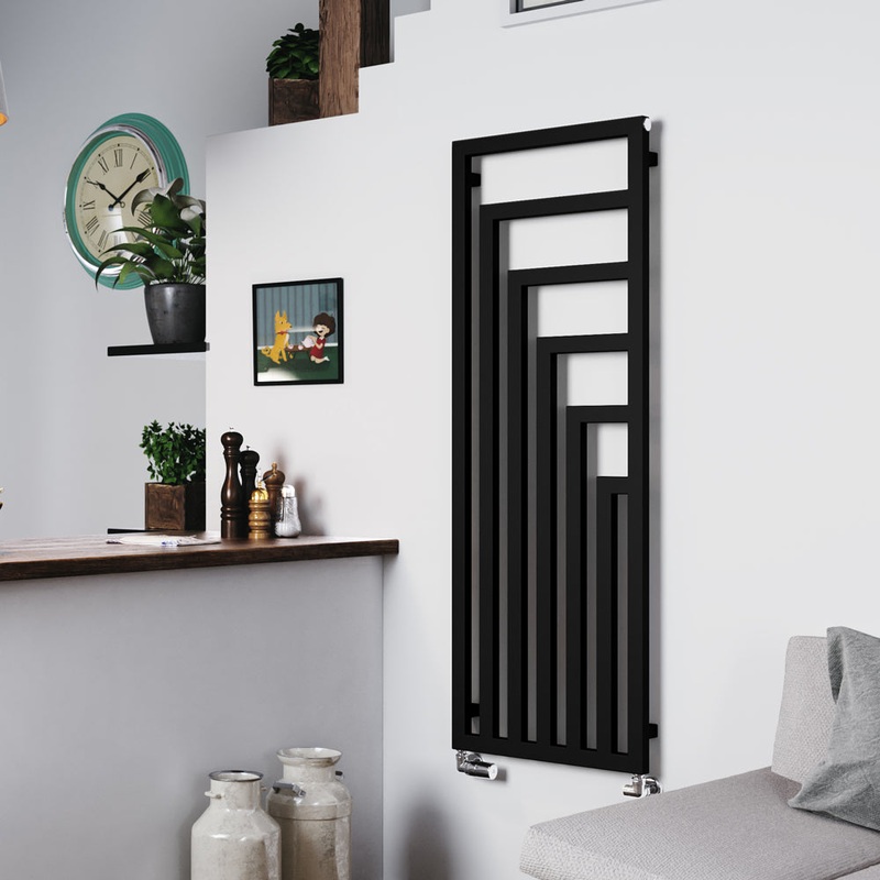 Terma aims to think differently when conceiving its radiator designs and the Harley features diamond shaped bars formed in ever decreasing right angle profiles – creating a unique linear design which differs from standard bar design radiators. Angus is finished in a square profile frame – making it appear like a piece of art on the wall and will look equally as effective in a bathroom or standard room of the house. The brackets on the Angus are a matching colour and style helping to achieve a look as if the radiator is simply floating. The Heban Black colour from Terma has a matt, rough textured finish. Angus features underside entry points for the valves meaning these can be tucked underneath out of the way and won’t stick out on the sides like ears. Good if you have limited width in which to install the radiator.