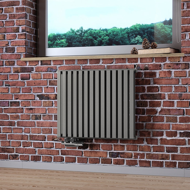 Terma aims to think differently when conceiving its radiator designs and the Nemo is a very simple, classic design but a strong step away from a standard entry level panel radiator. Nemo retains straight lines and liner geometry at its core. Nemo features a flat shelf like design at the top, with a slight staircase design as the rear bars steps down to the front bar. The Metallic Stone colour from Terma has a matt, rough texture. Nemo features 50mm pipe connections so we suggest matching this with a 50mm H block valve which will provide a neat finish.